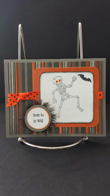 Just thought I would throw a card together while in watching football. Loving my bat stamp and my sentiment stamp from my own stamp line Halloweenville. Too cute! This skeleton stamp is from a Stampin Up set and my sister in law gave me this pretty paper a few years ago. No cricut required this time. Lol. Enjoy and all stamps are on sale for $8 and you will be entered in for a a chance for a FREE set. Happy Sunday!!!